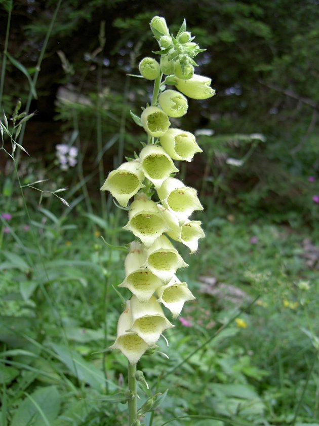 Digitalis luteaDer Gelbe Fingerhut (Digitalis lutea) ist nicht nur als Zierpflanze in heimischen Gärten anzutreffen, auch in der freien Natur kommt er bis in einer Höhe von 2000 Metern vor. Die Pflanze wird 50 Zentimeter bis 1 Meter groß und blüht von Juni bis August. Die hellgelben zwei bis zweieinhalb Zentimeter großen Blüten sind kleiner als beim Großen Gelben Fingerhut (Digitalis grandiflora). Die Blüten sind innen behaart und haben 5 zugespitzte Zipfel.