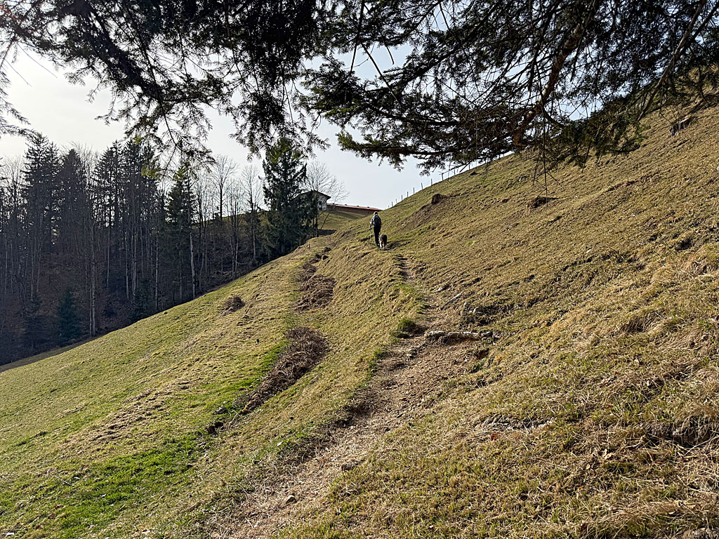 Im Wald überqueren wir den Schwaigsbach und gelangen nach einem Rechtsknick zu einem Weidezaun. Wir bleiben rechts des Zauns, passieren ein Drehkreuz und tauchen erneut den schattigen Bergwald ein. Dort folgen wir dem Schwaigsbach ein Stück bergauf und betreten dann am nächsten Drehkreuz das weitläufige Wiesengelände. In westlicher Richtung steuern wir auf den Weiler Kitzbichl zu und treffen unterhalb des Gehöfts auf einen Querweg. Wir schwenken scharf rechts in den Karrenweg ein und folgen diesem in nordwestlicher Richtung bergauf. Kurz vor dem Waldrand verlassen wir den Fahrweg und biegen linkshaltend in einen Wiesenweg ein (Wegweiser „Brennkopf”).