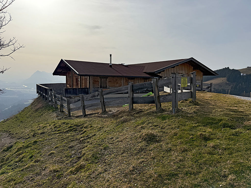 Wenig später geht der Wiesenweg in einen steinigen Waldweg über, der uns in kurzen Kehren zügig aufwärts leitet. Nach einer Lichtung, von der aus wir über Kitzbichl auf den Zahmen Kaiser blicken können, wird unser Weg deutlich breiter. Es folgt eine Rechtskehre und wandern wir in nordöstlicher Richtung zu einem Weidezaun hinauf. Dort passieren wir einen Durchlass und orientieren uns im Anschluss gleich nach links. In der Folgezeit gewinnen wir in weiteren Serpentinen über das freie Almgelände an Höhe. Bald nach einem einsamen, knorrigen Baum vollzieht unser Weg einen Linksknick und leitet uns auf die Hitscheralm zu. Kurz vor der Alm weichen wir nach rechts aus und peilen eine Rastbank und einen Schilderbaum an.