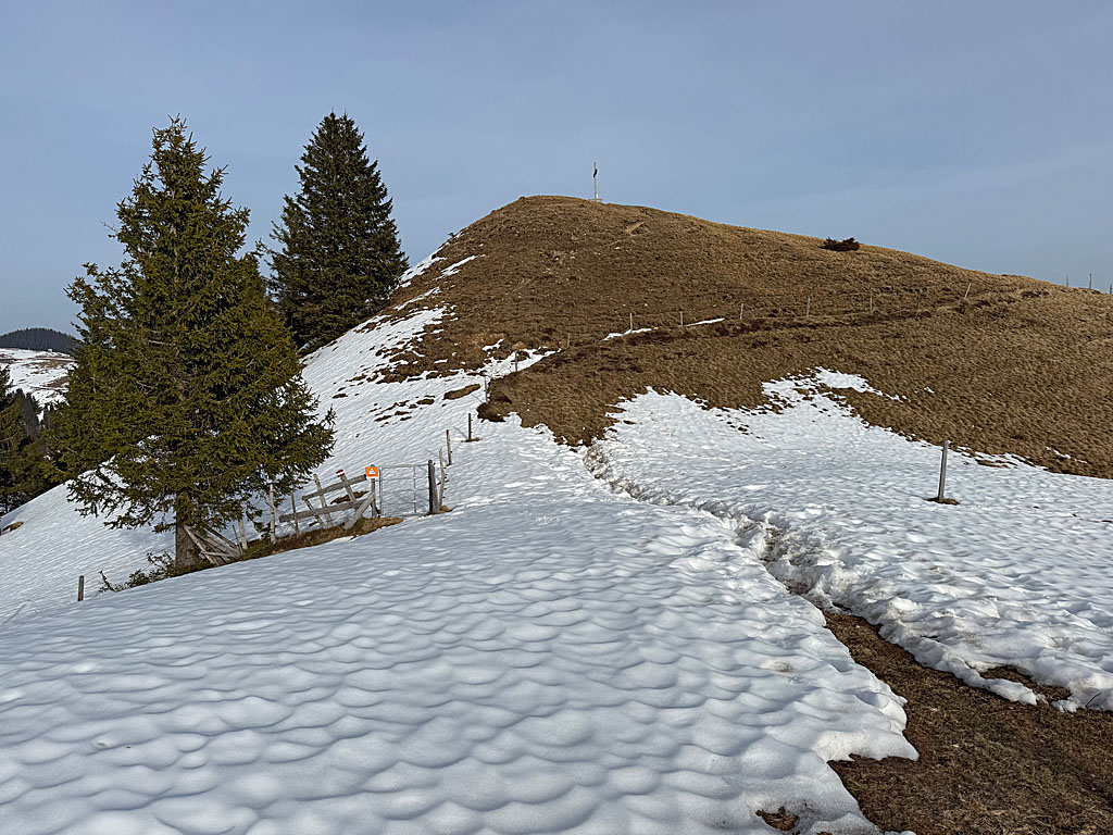 Am Wegweiser biegen wir in den breiten Fahrweg Richtung Brennkopf und Burgeralm ein. Wir halten uns in nördlicher Richtung auf einen Hof zu und passieren diesen in einem Rechtsbogen. Der Fahrweg wendet sich nun nach Nordosten und schlängelt sich mit moderater Steigung bergauf. Wir ignorieren einen Karrenweg, der nach links wegführt, und gehen an der Marschbachalm, der Hagerhütte und der Knollalm vorbei. Kurz nach der Knollalm gabelt sich der Weg und wir biegen links zum Brennkopf ab. Der Karrenweg bringt uns nach einer Linkskurve und einem Rechtsbogen zu einer Verzweigung. Nun halten wir uns recht, wandern in Kehren bergauf und erreichen nach einer Rechtskurve einen Durchlass im Weidezaun. Nach dem Durchschlupf steigen wir steil über die grasige Ostseite zum Holzkreuz am Brennkopf empor.