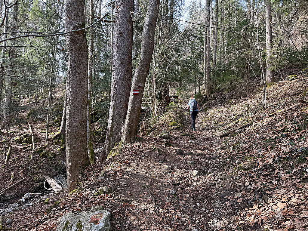 In einer Rechtskurve betreten wir den schattigen Bergwald und gelangen nach einigen Kehren zu einem Bachgraben. Nach zwei steilen Serpentinen passieren wir einen abschüssigen Hang, der mit einem Drahtseilgeländer gesichert ist. Dann wandern wir über eine Lichtung weiter abwärts. Auf der Lichtung treffen wir auf die Überreste einer ehemaligen Materialseilbahn und biegen links ab. Schließlich treffen wir auf einen breiten Forstweg. Wir verlassen nun die beschilderte Route nach Oberberg und biegen rechts ab (nicht beschildert). In knapp 30 Minuten kehren wir auf der Forststraße, die an einem kleinen Wasserfall vorbei führt, zur Verzweigung beim Kitzbichl zurück. Ab hier gleicht der Abstieg dem Aufstiegsweg.