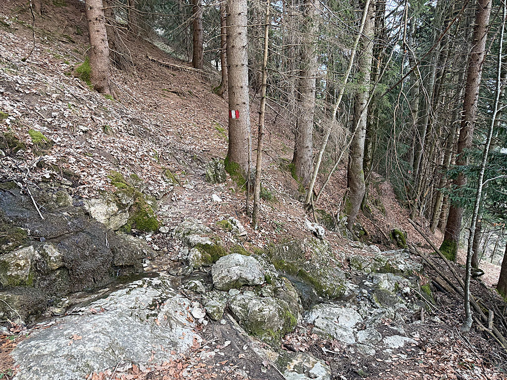 Vom Parkplatz aus gehen wir zurück zur Straße, wenden uns nach rechts und spazieren am Schwemmturm vorbei. Kurz nach dem Turm steigen wir eine Treppe hinauf, die uns zur Straße führt, die wir überqueren. Auf der gegenüberliegenden Straßenseite steuern wir auf ein Gehöft zu. Noch bevor wir den Hof erreichen, biegen wir an einer Brücke links in einen Wanderweg ein. Kurz darauf stoßen wir auf ein Drehkreuz und überqueren einen Bach. Nach dem kleinen Bachlauf wandern wir in nördlicher Richtung über eine grasige Rampe bergauf. Sobald sich der linke und der rechte Waldrand näher zusammenschieben, wenden wir uns nach links und folgen dem rot-weiß markierten Weg in den Wald hinein.
