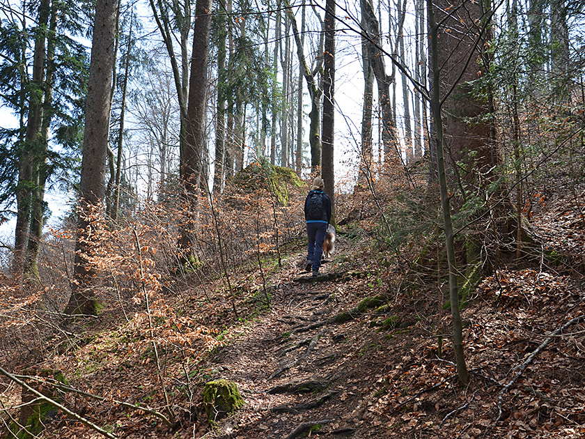 Ein schmaler Pfad leitet uns in einen Graben hinunter, den wir mit Hilfe einer schmalen Brücke überqueren. Nach der Brücke leitet uns ein wurzeliger Pfad in engen Kehren steil bergauf. Kurz darauf touchieren wir eine Lichtung und wandern durch den Wald in weiteren Serpentinen aufwärts. Schließlich treffen wir auf einen Querweg und biegen dort rechts ab (Wegweiser „Buch/Zwieselberg“). Ein Karrenweg leitet uns ein Stück nordwärts und in einem großzügigen Linksbogen zu einer Lichtung. Dort schlüpfen wir schräg linkshaltend wieder in den Wald hinein und wandern steil in kurzen Kehren hinauf einem Aussichtsplatz mit einer Sitzbank. Von hier können wir einen ersten schönen Ausblick auf den Forggensee und zu den Ammergauer Alpen genießen. Am Aussichtsplatz wenden wir uns nach rechts und folgen einem steilen Karrenweg weiter hinauf zum Rücken des Zwieselbergs.