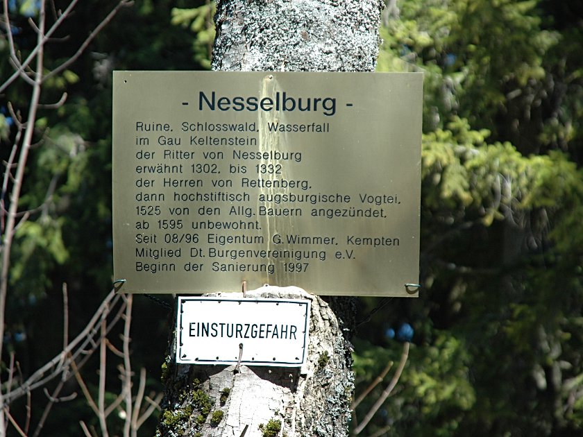 Bahnfahrer, die mit der Außerfernbahn gekommen sind, überqueren die Gleise im Osten vom Bahnhof und folgen den Wegweisern zum Edelsberg und der Alpspitz. Der Weg führt zunächst links an einem Bach entlang. Nachdem wir eine Straße überquert haben, treffen wir auf einen Wegweiser zum Wasserfallweg. Die Autofahrer erreichen den Wasserfallweg vom Parkplatz der Alpspitzbahn aus. Am Anfang des Wasserfallweges besteht auch die Möglichkeit, gleich links zur Ruine Nesselburg aufzusteigen. Wir halten uns jedoch rechts, um auch dem Wasserfall einen Besuch abstatten zu können. Dieser ist bereits nach wenigen Minuten erreicht. Nun geht es über zahlreiche Stufen und Stege etwas steiler bergauf, bis wir etwa 5 Minuten später einen Wegweiser erreichen, der nach links zur Ruine Nesselburg zeigt.