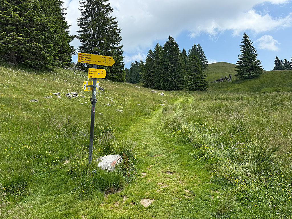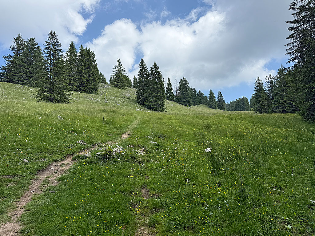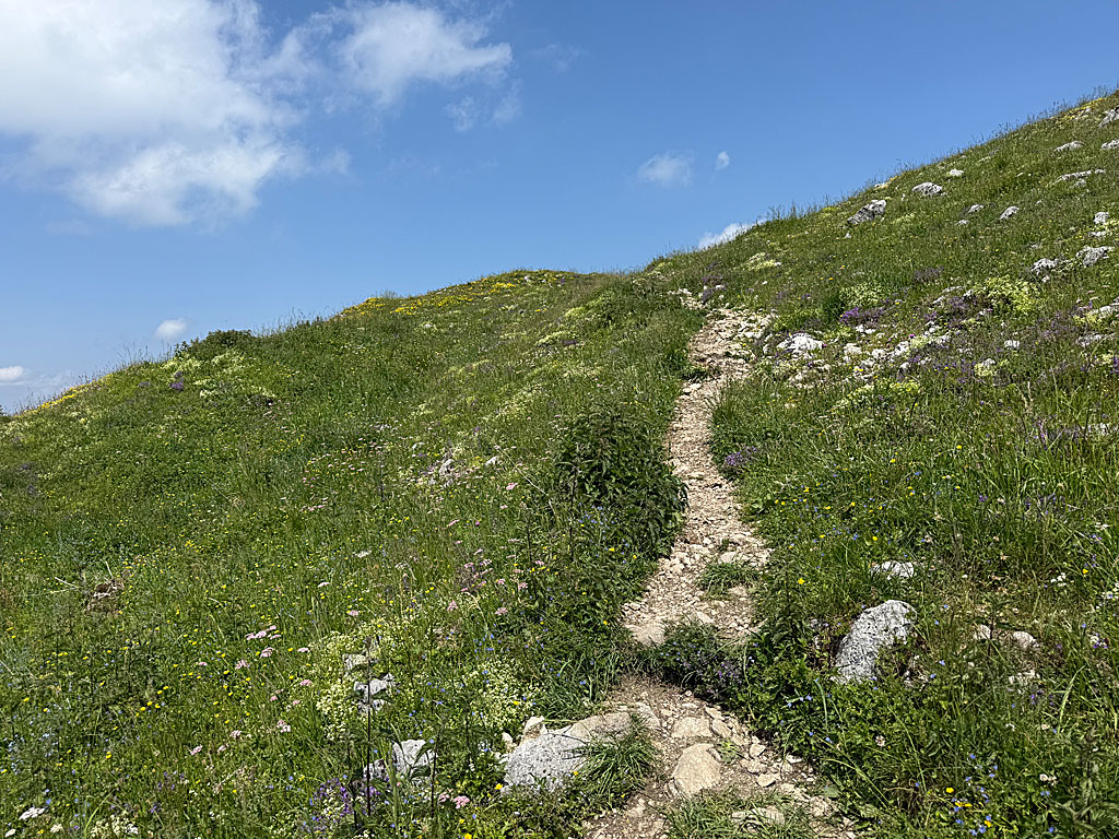 Über das Wiesengelände wandern wir zum Gipfel hinauf