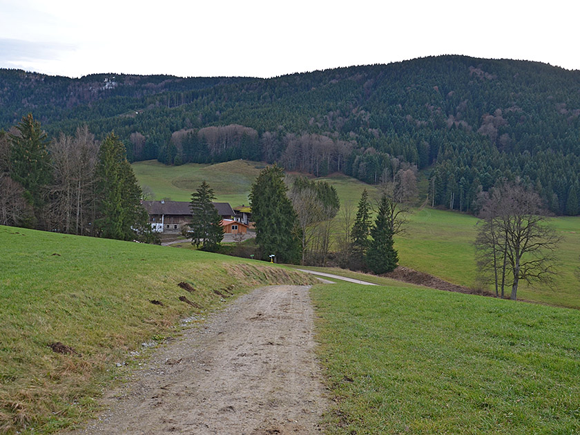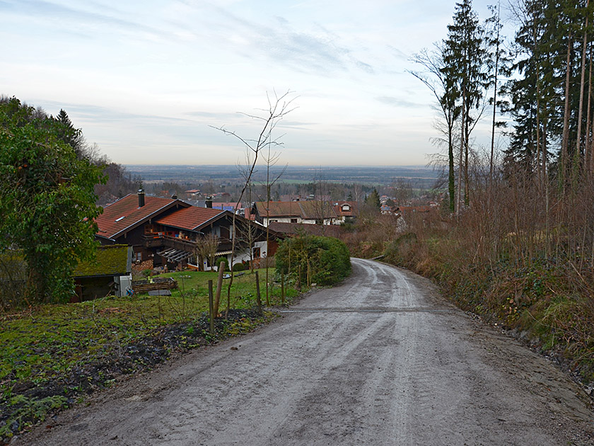 Für den Rückweg nach Bad Feilnbach wählen wir den Abstieg über Thalhäusler. Dazu gehen wir vom Berggasthof zurück über den uns bekannten Wiesenweg zum Schilderbaum am Waldrand. Am Waldrand wenden wir uns nach rechts (Wegweiser "Bad Feilnbach über Thalhäusler") und folgen einem kleinen Pfad zu einer Treppe. Wir steigen über einige Stufen bergab und spazieren entlang einer Lichtung in südwestlicher Richtung zum Weiler Sonnleiten. Wir passieren die kleine Siedlung und gelangen nach einer langgezogenen Linkskurve vor dem Weiler Grub zu einer Kreuzung. Nun biegen wir rechts ab (Wegweiser "Tregleralm, Bad Feilnbach über Thalhäusl") und gehen zur Landstraße hinunter.