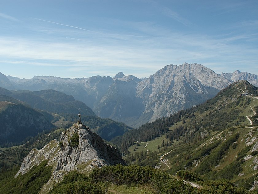 Zusammen mit vielen anderen, die vorwiegend mit der Seilbahn gekommen sind, erreichen wir zehn Minuten später die Aussichtsplattform kurz unterhalb des Gipfels. Hier hat man einen schönen Blick auf den unter uns liegenden Königssee. Noch ein paar Höhenmeter und zwei Minuten später stehen wir neben dem Gipfelkreuz des 1874 Meter hohen Jenners. Im Süden ist im Steinernen Meer gut der pyramidenförmige Gipfel der Schönfeldspitze zu sehen. Das Watzmannmassiv dominiert im Westen. Im Nordwesten zeigt sich der Untersberg mit dem Berchtesgadener und Salzburger Hochthron. Unser nächstes Ziel, das Hohe Brett (2340 m), liegt im Osten.