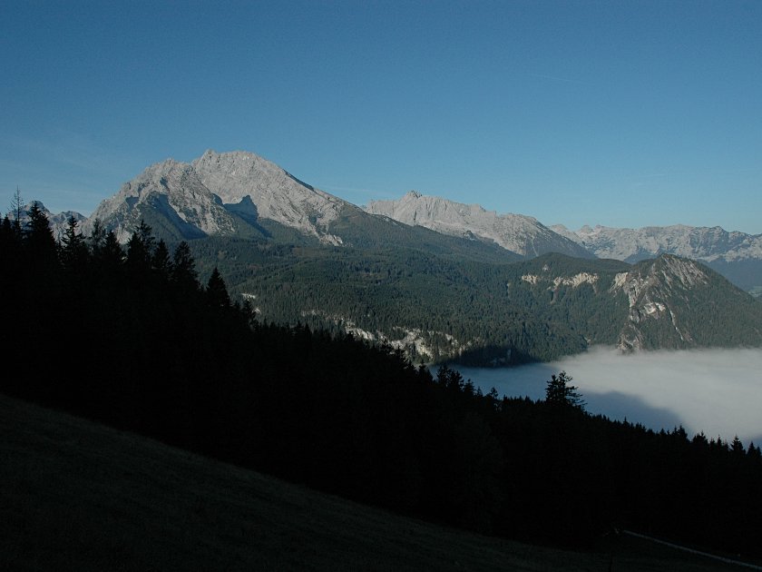 Vom Wanderparkplatz in Hinterbrand geht es über den Weg 498 recht gemächlich auf die Mittelstation der Jennerbahn zu. Noch bevor wir diese erreichen, biegen wir nach links auf den Weg 498a ein. Die nächsten 40 Minuten wird es auf dem Pfad über eine Almwiese etwas steiler, bis wir abermals auf eine Forststraße treffen. Imposant zeigt sich wärend des Aufstiegs im Süden der Watzmann. 15 Minuten später haben wir auf der Forststraße den Vogelstein halb umrundet und passieren die Mitterkaseralm.