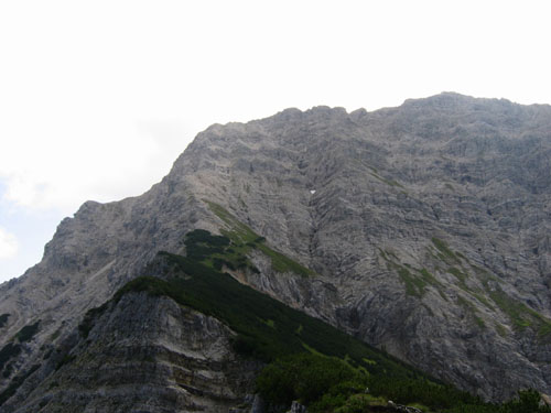 Latschen hindurch den Gipfelaufbau der Kreuzspitze. Der schwierigste