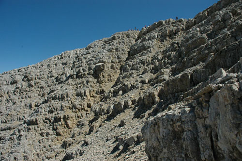 die Scharte zu. Hier in 2533 Metern Höhe beginnt der schwierigere