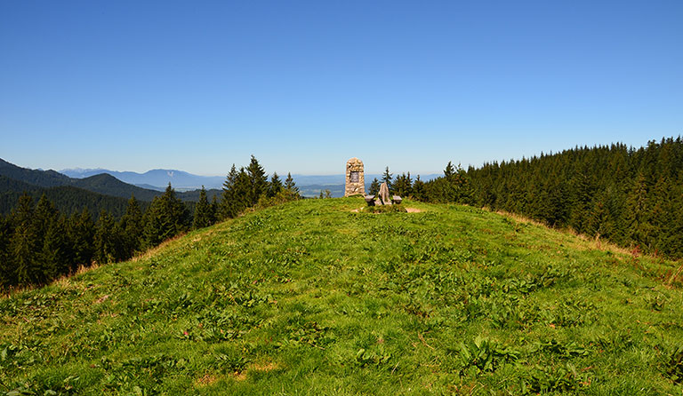 Sobald die beiden Wege wieder zusammen finden, gelangen wir zu einer Verzweigung. Hier bleiben wir auf unserem Weg und wandern weiter geradeaus (Wegweiser Neulandhütte). Bald darauf treten wir aus dem Wald heraus und treffen auf einen Weidezaun. Hier schlüpfen wir beim Viehgatter hindurch und wandern auf die grasige Gipfelkuppe des Längenbergs zu. Rechter Hand erkennen wir dann auch schon bald die Neulandhütte, ein Selbstversorgerhaus der DAV-Sektion Neuland. Am Fuße der Kuppe angelangt steigen wir diese weglos hinauf und erreichen einen Bergrücken. Über diesen spazieren wir hinüber zu zwei Sitzbänken und einem Gedenkstein.