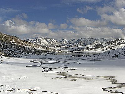 Wiesen der Ninosee. Im Hintergrund erhebt sich die gewaltige Gebirgskette