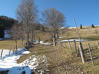 Vor dem Berggasthof befindet sich eine kleine Kapelle. Um zum Rehleitenkopf zu gelangen spazieren wir zwischen Gasthof und Kapelle hindurch. Nach einem großen Baum und den Holzäunen treffen wir auf einen Querweg. Hier biegen wir links ab und wandern zu einem Waldstück. Nach dem Wald steigen wir über das Almgelände weglos hinauf zum grasigen Bergrücken. Nun folgen wir dem Bergrücken aufwärts. Gegen Ende des Rückens sehen wir rechts von uns die felsige Nadel des Rehleitenkopfs herausspitzen.