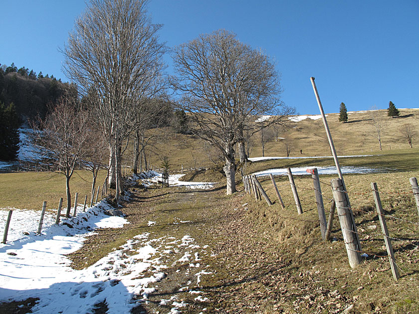 In einem Rechtsbogen wandern wir über den Kamm zu einem Waldstück. An einem Durchlass überqueren wir den Weidezaun und spazieren im Anschluss durch den Bergwald. Nach dem Wald befinden wir uns am Fuße des Rehleitenkopfs und steigen steil zum Gipfelkreuz dieses kleinen Zinkens hinauf.