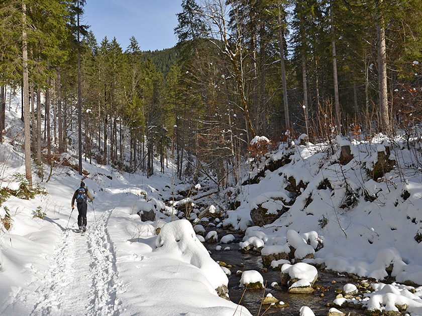 Vom Wanderparkplatz Winterstube folgen wir dem breiten Forstweg in nordwestlicher Richtung (gelber Wegweiser "Schwarzentennalm, Buchsteinhütte"). Nach gut fünf Minuten erreichen wir eine Verzweigung. Hier biegen wir links ab, überqueren den Schwarzenbach und halten uns gleich nach der Holzbrücke wieder rechts. Auch über den Forstweg würde man zur Schwarzentennalm gelangen. Dort muss man sich aber mit eventuellem Gegenverkehr von Rodlern und Skitourengehern auseinandersetzen. Wir folgen also dem Schwarzenbach ohne besonderen Höhengewinn nordwestwärts und wechseln über kleine Brücken des Öfteren die Seite des Bachs.