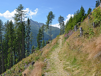 Kurz darauf endet der Forstweg und wir spazieren rechtshaltend durch das Holztor des Alpenblumenwegs. Über einen Pfad wandern wir über sanftes Wiesengelände in nordwestlicher Richtung weiter bergauf. Nach einer weiteren guten Viertelstunde treffen wir auf den Abzweig zum Weißen Beil, den wir rechts liegen lassen. Wir gehen immer geradeaus und können schon kurz darauf erste Ausblicke zu den Gipfeln der Rieserfernergruppe und zum Staller Sattel mit dem Obersee genießen. Unser Weg schwenkt nun in nördliche Richtung und vor uns tauchen nun der Gipfel der Seespitze und die Seepitzhütte auf. Unterhalb der Hütte nimmt die Steigung des Weges noch einmal zu.