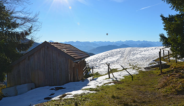 Gleich nach der Holzbank halten wir uns links und folgen dem rot-weiß markierten Pfad in mehreren Serpentinen durch das Waldstück bergauf. Nach dem Waldstück gelangen wir zu einem Querweg. Hier treffen der Sonntratnsteig und der Sonntratnweg aufeinander. Wir gehen geradeaus weiter und wandern über einen schmalen Pfad den grasigen Gipfelhang hinauf. Schließlich treffen wir auf einen Zaun mit einem Drehkreuz. Vor dem Drehkreuz findet sich eine Sitzbank und eine schöne sonnenverwöhnte Wiese. Von hier lässt sich wunderbar der Ausblick über das Isartal genießen. Wer durch das Drehkreuz hindurch geht, der kann noch der eingezäunten Gipfelwiese mit den beiden Holzhütten einen Besuch abstatten.