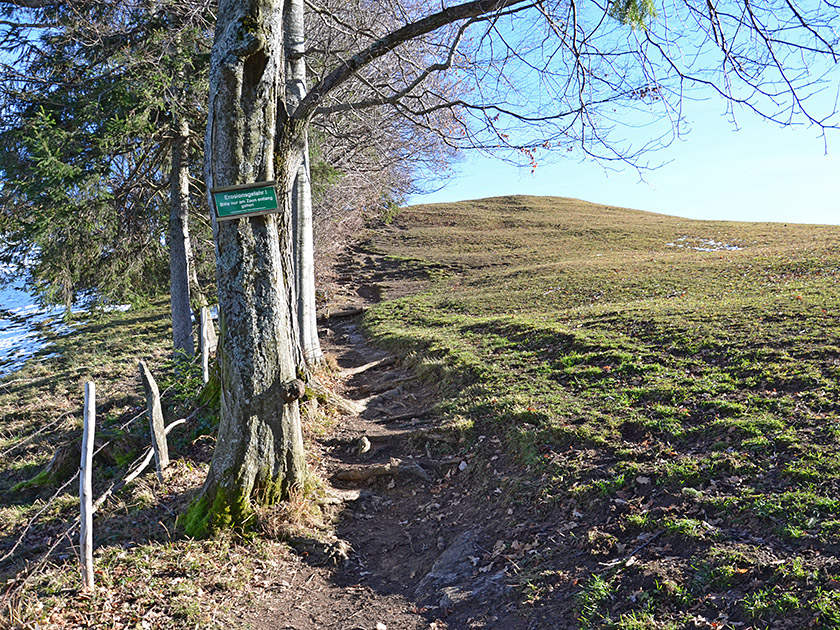 Der Weg quert in sanfter Steigung einen grasigen Hang und bringt uns zu einer Baumreihe und einem Zaun. Nun dreht der Pfad nach links ab und führt am Zaun entlang und in vielen Serpentinen steil den grasigen Hang hinauf. Schließlich gelangen wir zu einem Durchlass am Weidezaun. Hier vollzieht unser Weg einen Rechtsknick und wir steigen rechts des Zauns und einer Baumreihe bleibend weiter bergauf. Nach einem steileren Anstieg leitet uns der Weg nach links zwischen der Baumreihe hindurch und über eine Wiese zu einem Durchlass. Dort passieren wir den Durchlass und folgen in nordöstlicher Richtung einem Wiesenpfad, der uns zum Waldrand bringt. Dort treffen wir auf eine Sitzbank.
