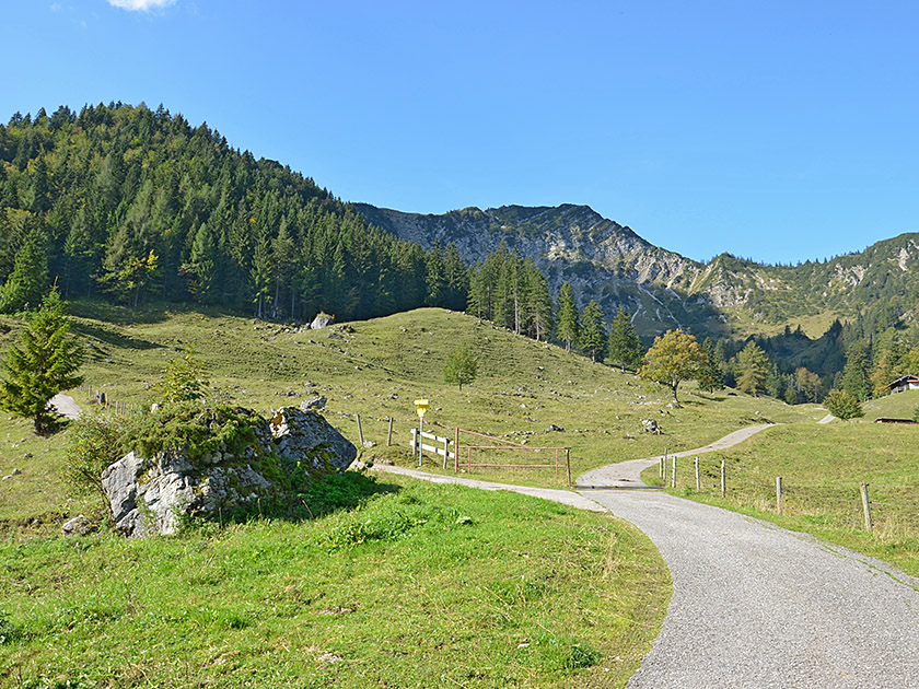 Vom Wanderparkplatz unterhalb vom Berggasthof Rosengasse spazieren wir über die Teerstraße zum Gasthof hinauf. Diesen lassen wir links liegen und biegen nach dem Gebäude rechtshaltend in einen asphaltierten Weg ein (Wegweiser "Brünnsteinhaus, Großer Traithen"). Nach einem kurzen Anstieg gelangen wir zu einer Verzweigung. Hier gehen wir nach links (Wegweiser "Großer Traithen") und passieren eine kleine Kapelle, die rechts von uns auf einer Anhöhe thront. Wir folgen weiter dem geteerten Weg, der uns nach wenigen Minuten zu einer Gabelung bringt. Nun halten wir uns links, überqueren einen Weiderost und spazieren danach links an der Kranzlerhütte vorbei.