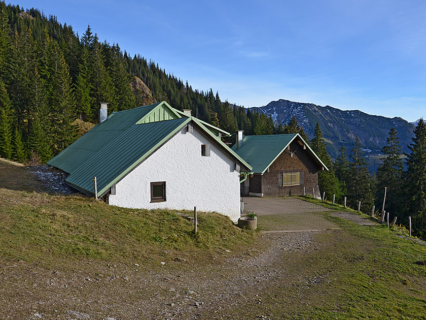 Wir steigen über einen erodierten Pfad den Grashang hinauf. Der Pfad wird nach kurzer Zeit zu einem breiten Karrenweg, über den wir zu einem Waldrand spazieren. An den Bäumen wendet sich der Weg nach rechts und wir treffen auf einen Querweg. Nun überqueren wir den breiten Forstweg und folgen dem Wiesenweg zur Buchelalpe hinauf, die wir nach etwa 40 Minuten erreichen. Vor der Almhütte biegen wir scharf links ab und schlagen den breiten Forstweg ein, der westwärts von der Buchelalpe wegführt (Wegweiser "Wertacher Hörnle"). Nach einem steileren Anstieg und einer Rechtskehre treffen wir auf eine Verzweigung. Hier wählen wir den linken (oberen) Weg und folgen dem breiten Weg in ein Waldstück hinein.