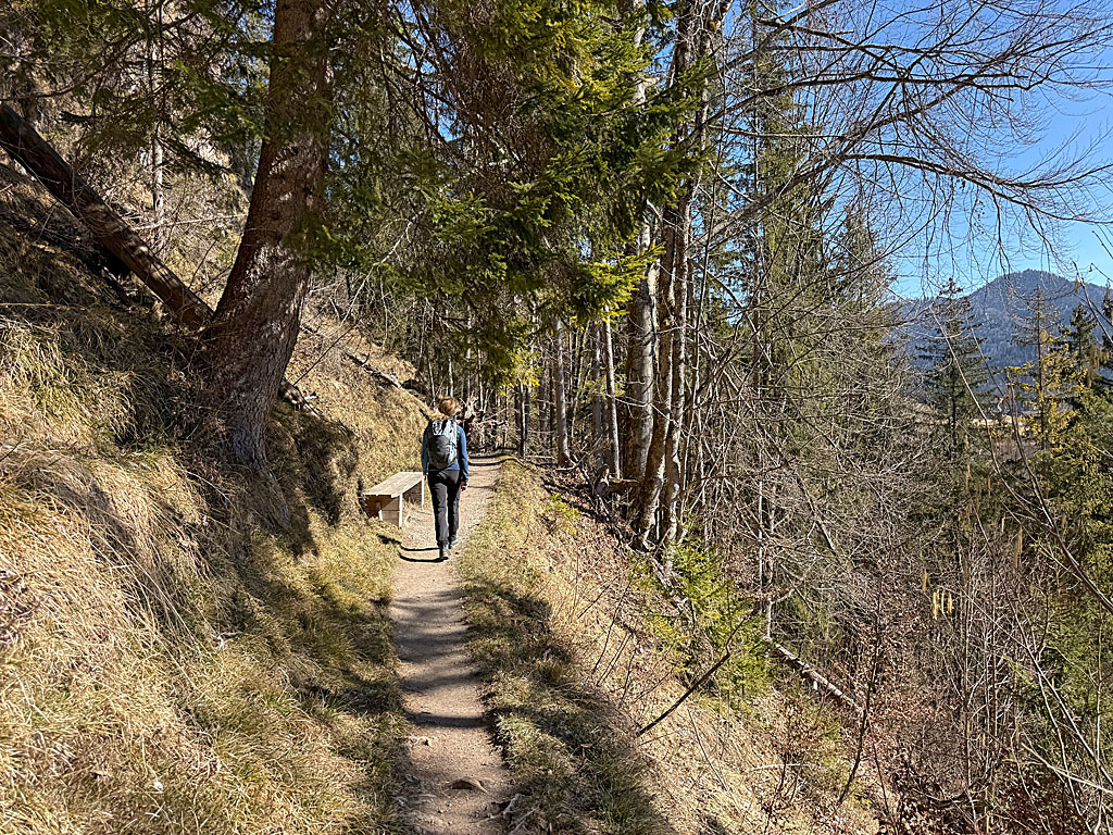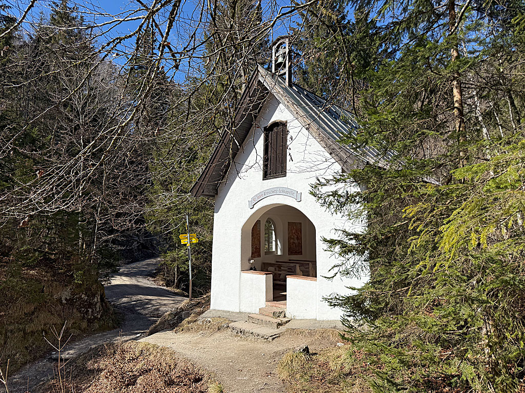 Der kurvige Pfad schlängelt sich nun immer am Hang entlang, und wir wandern durch lichte Waldstücke und über kleine Holzbrücken ostwärts. Nach einer Rastbank verlieren wir ein paar Höhenmeter und treffen auf den Kreuzweg, der von Reit im Winkl heraufkommt. Wir schwenken linkshaltend in diesen ein, passieren eine Felswand und lassen in einer Linkskurve einen Abzweig rechts liegen. Nach zwei kurzen Kehren erreichen wir die Eckkapelle (869 m) und biegen dort links in eine Forststraße ein (Wegweiser „Wetterkreuz, Hutzenalm“). Die breite und moderat ansteigende Trasse leitet uns in der Folgezeit nordwestwärts. Dabei bleiben wir stets am Forstweg und ignorieren den Abzweig zum Hausbachfall.