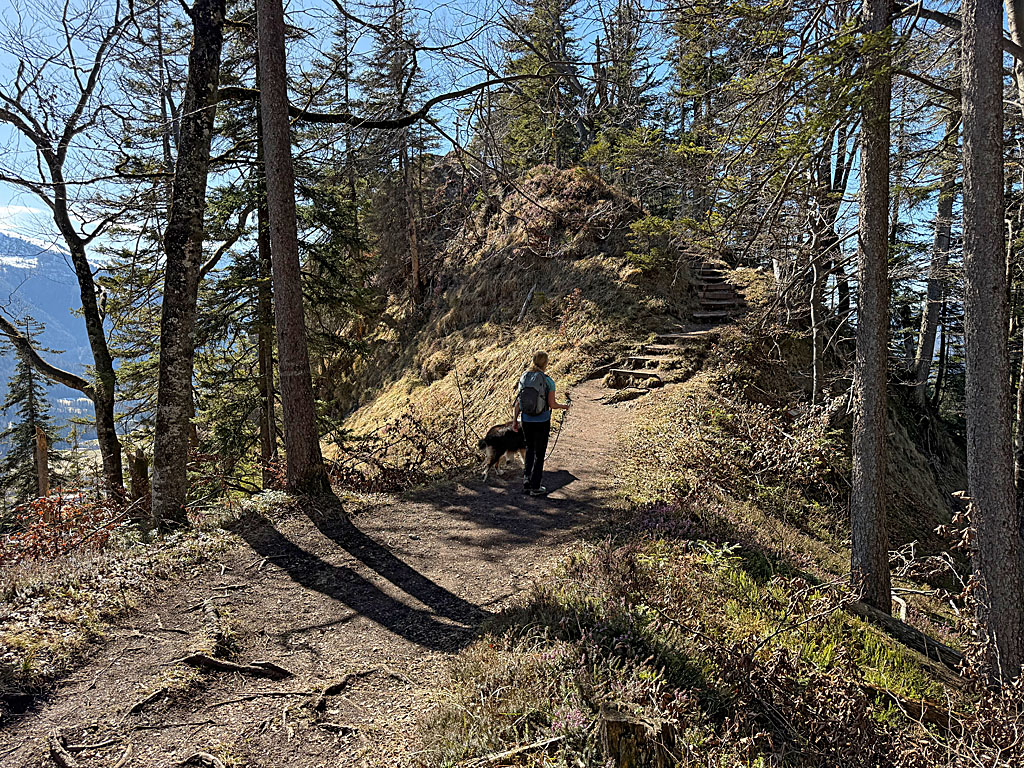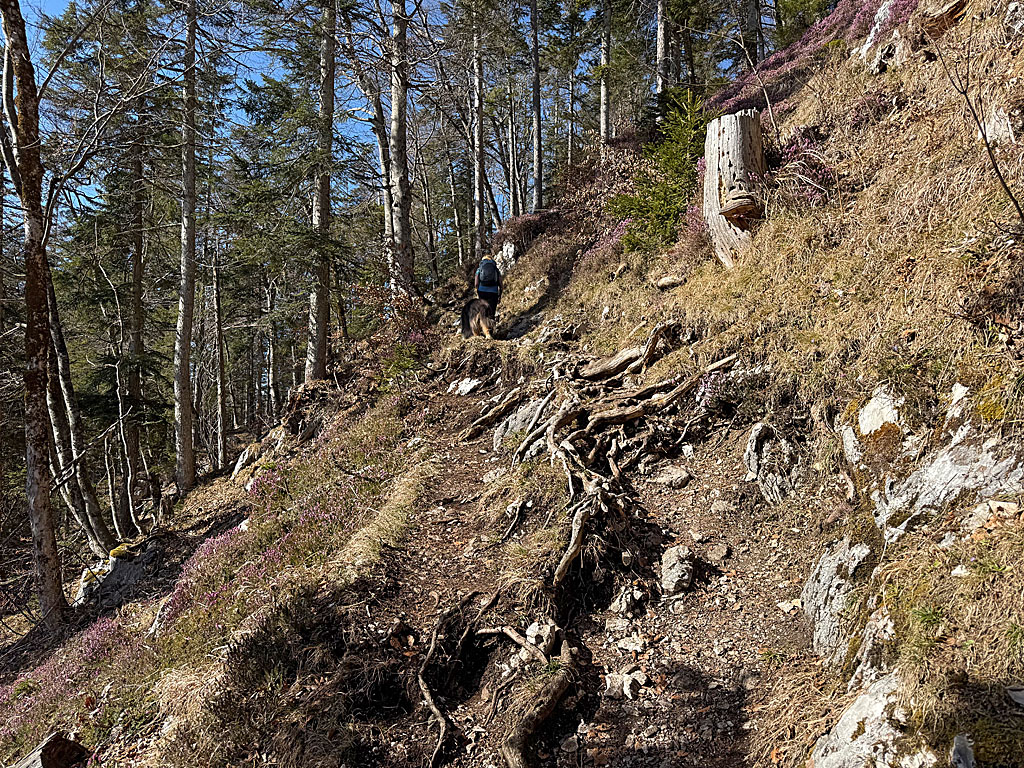 Vom Gipfelkreuz steigen wir auf dem gleichen Weg zum Sattel hinunter. Dort wenden wir uns nach links. Weiterhin dem Hinweg folgend erreichen wir wieder den beschilderten Abzweig. Jetzt verlassen wir den Anstiegsweg und biegen links in die Route zur Hutzenalm ein. Ein kleiner Pfad leitet uns in südwestlicher Richtung bergauf. Kurzzeitig queren wir auf dem holprigen Steig einen etwas abschüssigeren Waldhang. Nach der Querung kommen wir zu einer bewaldeten Hochfläche mit einer Rastbank. Nun halten wir uns rechts und gehen auf einem Waldweg nordostwärts. Kurz darauf kommen wir zu einem Abzweig und biegen links ab Richtung Hutzenalm.