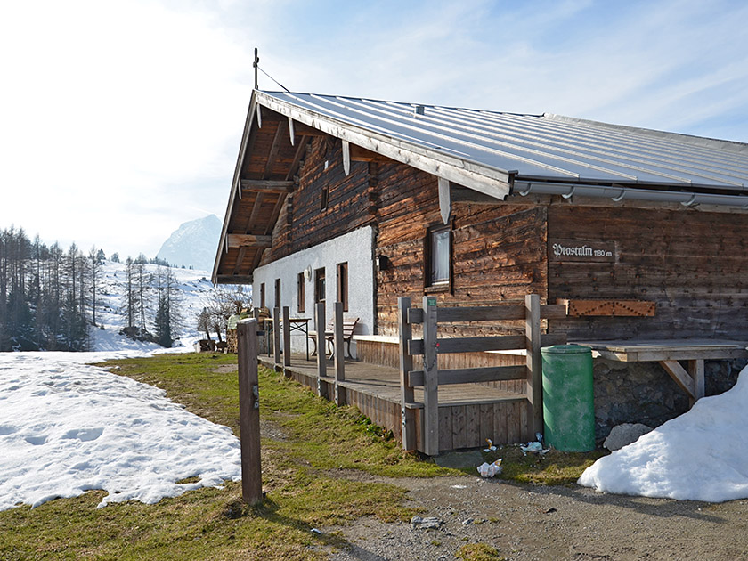 Die Prostalm ist eine bewirtschaftete Alm im östlichen Kaisergebirge. Sie liegt am Fuße des Prostkogels und hat von Mitte bis Mitte Oktober geöffnet (Montag ist Ruhetag). Von der Alm hat man einen schönen Blick hinüber auf die Ostseite des Wilden Kaisers mit der Maukspitze, der Ackerlspitze und dem Lärcheck. Das Gipfelkreuz am grasigen Prostkogel erreicht man von der Alm in gut 10 Minuten. Vom überraschend aussichtsreichen Gipfelplateau kann man die herrliche Aussicht zu den Loferer Steinbergen und zu den benachbarten Vertretern der Chiemgauer Alpen genießen. Am schnellsten gelangt von Hinterberg zur Prostalm. Der direkte Aufstieg über die Marcheralm dauert etwa eine Stunde. Etwas länger aber dafür viel spannender ist die Anstiegsvariante durch die Teufelsgasse. Für den wirklich lohnenden Umweg durch das felsige Labyrinth der Teufelsgasse muss man mit einer zusätzlichen Gehzeit von einer halben Stunde rechnen.