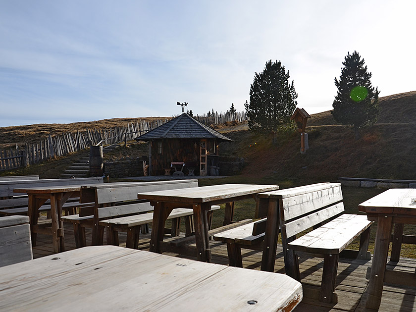 Wegbeschreibung: Vom Parkplatz Herol (1650 m) wandern wir über den Forstweg ein nordwestlicher Richtung in sanfter Steigung bergauf zu einem Waldstück. Dort verlassen wir den breiten Weg über einen markierten Pfad nach schräg links. Zurück am Forstweg biegen wir links und kurz darauf an einem Waldrand nach rechts ab. Den Bäumen folgend und später durch den Bergwald gelangen wir zurück zum Forstweg. Nach zwei Kehren verlassen wir den Forstweg linkshaltend über einen Pfad und wandern hinauf zu einer Holzhütte. Dort halten wir uns rechts und kommen später zum Querweg, der vom Parkplatz Zumis zur Rastnerhütte führt. Nun halten wir uns nochmals rechts und erreichen nach knapp 10 Minuten den beschilderten Abzweig zur Rastnerhütte. Hier biegen wir links ab und gelangen nach einer Gehzeit von einer Stunde zur Hütte. Alternativ wandert man vom Parkplatz Zumis (1725 m) über die Ronerhütte (1832 m) und dem Pianer Wegkreuz (1901 m) zur Rastnerhütte.