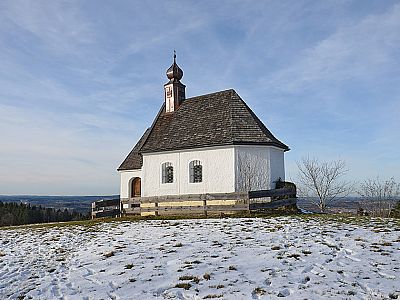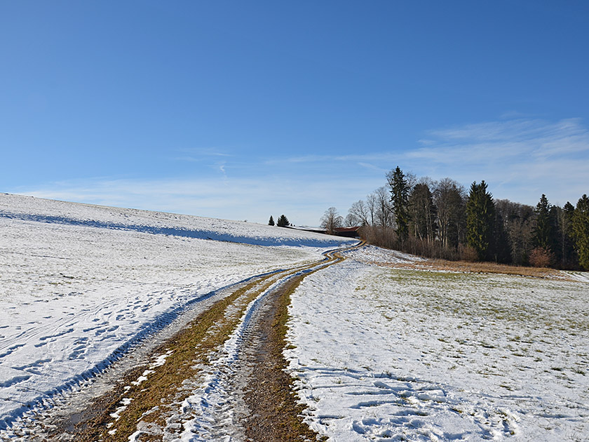 Südöstlich von Miesbach erhebt sich zwischen dem Tal der Schlierach und dem Leitzachtal der Stadlberg. Bekannt ist der langgezogene Höhenrücken besonders wegen der Stadlbergalm. Der Berggasthof ist ganzjährig von Mittwoch bis Samstag geöffnet und bietet warme Speisen, kalte Brotzeiten und hausgemachte Kuchen. Vom Krankenhaus Agatharied lässt sich die Stadlbergalm mit dem Auto anfahren. Für eine Wanderung zum Stadlberg bietet sich Miesbach als Ausgangspunkt an. Im Winter könnte man bei hoher Schneelage bis zum Weiler Stadlberg über einen Teerweg aufsteigen. Wir möchten den Teerstraßen so gut es geht aus dem Weg gehen und wählen den Hinweg über Harztal und den Rückweg über Kiental. Ganz ohne asphaltierte Wege geht es leider nicht. Da diese nur wenig befahren werden, ist das allerdings kein Drama. Von der Kapelle oberhalb der Stadlbergalm ist die Aussicht nur sehr beschränkt. Den schönsten Panoramablick erlebt man am Weiler Stadlberg, der auch den höchsten Punkt der kleinen Rundwanderung markiert.