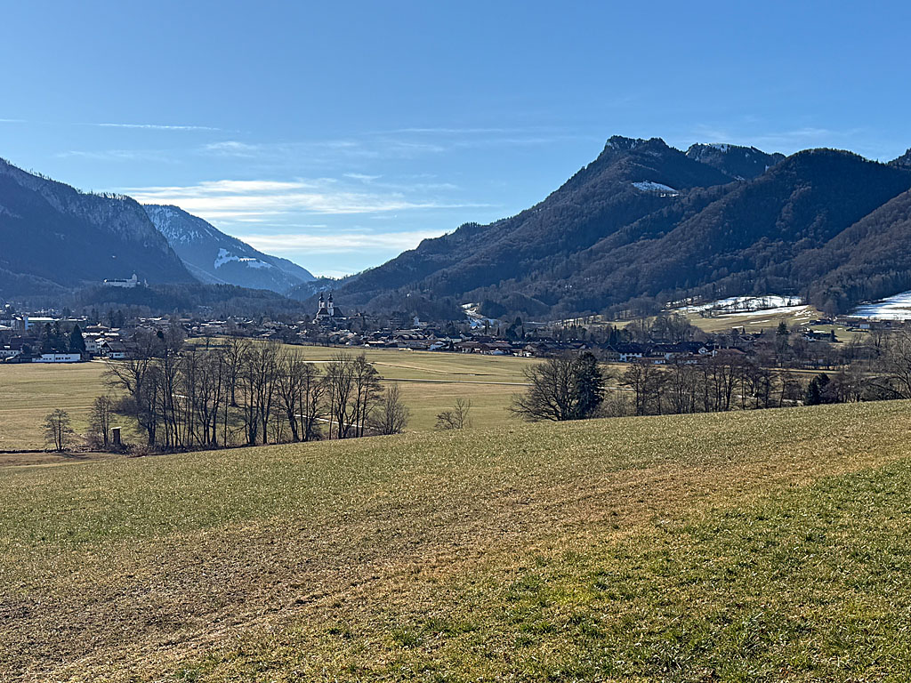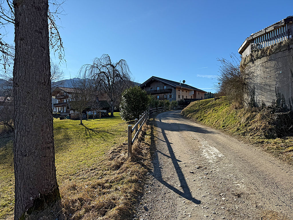 Nach dem Marterl lichtet sich langsam der Wald und wir verlieren im Anschluss ein paar Höhenmeter. Wir erreichen den westlichen Rand von Bernau und treffen dort auf die Engelländerstraße. Nun wenden wir uns nach links und an der folgenden Verzweigung wieder nach rechts. Über die Grabenfeldstraße kommen wir zum Ortsrand von Bernau. An einem Wegweiser halten wir uns leicht links und wandern über einen Wiesenhang empor zu einem Karrenweg. Die Grundrichtung beibehaltend nähern wir uns Reitham und genießen im freien Gelände die Ausblicke auf den Hochfelln, den Hochgern und die Kampenwand. In Reitham biegen wir gleich nach dem Schusterhof links und bei der nächsten Möglichkeit wieder rechts ab.