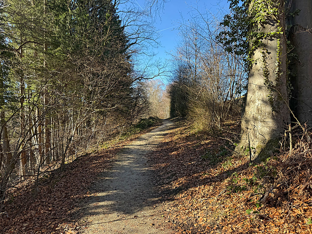 Wir verlassen den Parkplatz am Minigolfplatz und gehen zurück Richtung Kirchplatz. Vor dem Gasthof Alter Wirt überqueren wir an der Ampel linkshaltend die Rottauer Straße und spazieren in die Aschauer Staße hinein. Nach wenigen Metern halten wir uns direkt vor dem Raiffeisenplatz rechts und gleich wieder links. So gelangen wir auf die Hitzelsbergstraße, der wir in westlicher Richtung bergauf folgen (Wegweiser „Hitzelsberg Rundweg, Waldkapelle“). Nach wenigen Minuten weichen wir vor dem Gut Hitzelsberg schräg nach links aus und schlagen den beschilderten Fußweg Richtung Reitham, Bärnsee und Aschau ein. Der kleine Weg leitet uns auf der Südseite des Hitzelsberges durch ein lichtes Waldstück zu einem Wegkreuz.