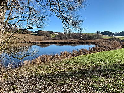 Dort biegen wir scharf links in einen Karrenweg ein, der uns hinunter zu einem Waldstück bringt. Wir touchieren in einem Rechtsbogen den Waldrand und passieren ein Marterl und eine Holzhütte. Im Anschluss steuern wir über den Feldweg in südwestlicher Richtung auf die Siedlung Berg zu. In Berg biegen wir nach einem ersten Gebäude links ab, gehen unter einem Torbogen hindurch und erreichen kurz vor der Kirche eine Landstraße, in die wir rechtshaltend einbiegen. Die Straße verlassen wir bei der ersten Möglichkeit gleich wieder nach links über einen Karrenweg. Dieser leitet uns hinuter zum nördlichen Ufer des Berger Sees. Sobald wir den nördlichen Ausläufer des Gewässers passiert haben, stoßen wir auf einen Querweg und biegen links ab. Nun spazieren wir an den Häusern auf der Westseite des Sees vorbei.