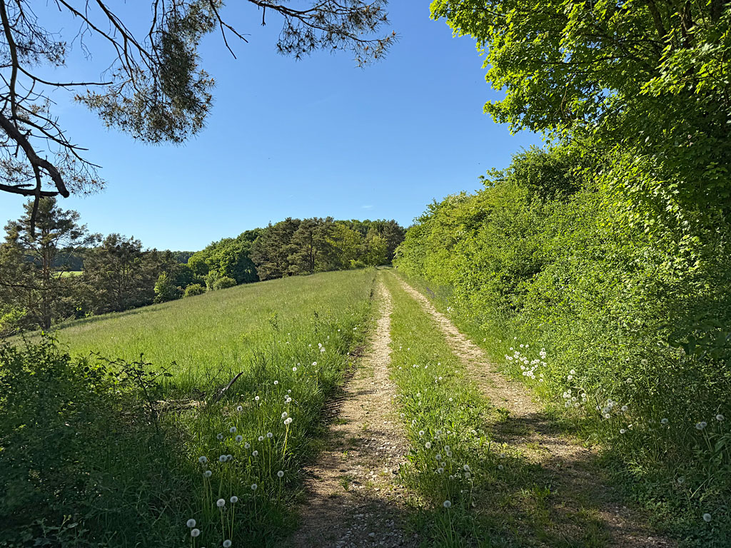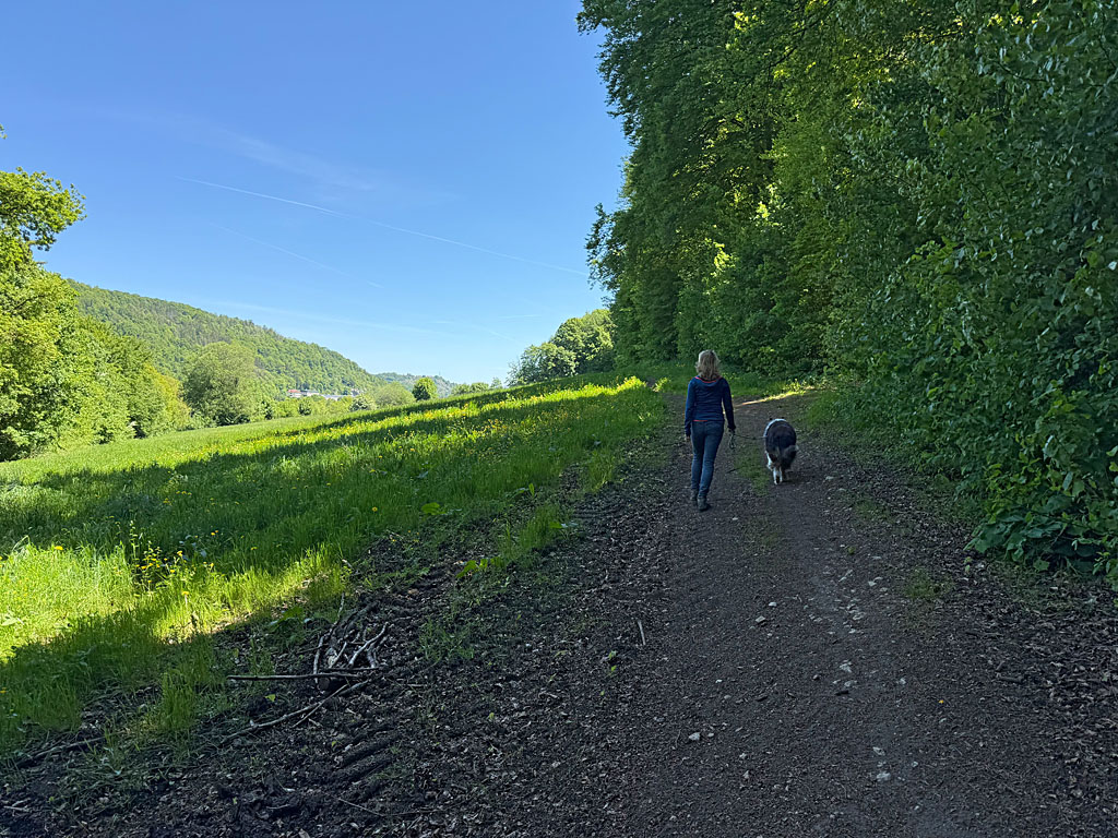 An diesem besonders schönen Flussabschnitt mit seinen Mäandern passieren wir auch den Fuß der Schellneckwand. Nach einem Rastplatz mit einer Holzbank kommen wir zu einer Verzweigung und biegen rechts ab (Wegweiser „Keltenwall, Weltenburg“). Durch ein Waldstück wandern wir bergauf und finden uns wenig später am Waldrand wieder. Mit einem schönen Blick über das Altmühltal folgen wir dem Wiesenweg südwestwärts. Wenig später tauchen wir wieder in den schattigen Wald ein und gelangen nach einem Rechtsbogen zu einem Querweg, in den wir rechtshaltend einschwenken. Nach wenigen Metern kommen wir zu einer weiteren Verzweigung und biegen links in einen kleinen Waldweg ein.