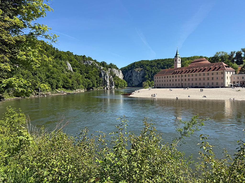 Am folgenden Abzweig verlässt der Donau-Altmühl-Rundweg den Wall. Wir biegen rechts ab und folgen einem Hohlweg hinunter zu einer Teerstraße. Nun halten wir uns links und spazieren hinab zur Donau. Auf der anderen Uferseite liegt das Kloster Weltenburg. Wir wenden uns nach rechts und kommen an den Anlegestellen der Zillen vorbei. Wir bleiben weiter auf der Straße, die sich ein Stück vom Donauufer entfernt. Schließlich erreichen wir Stausacker. Nach dem Feuerwehrhaus vollzieht die Straße einen Linksbogen und bringt uns zur Anlegestelle der Seilfähre. Wer den direkten Rückweg wählt, schwenkt im Linksbogen rechtshaltend in die Abt-Maurus-Straße ein.