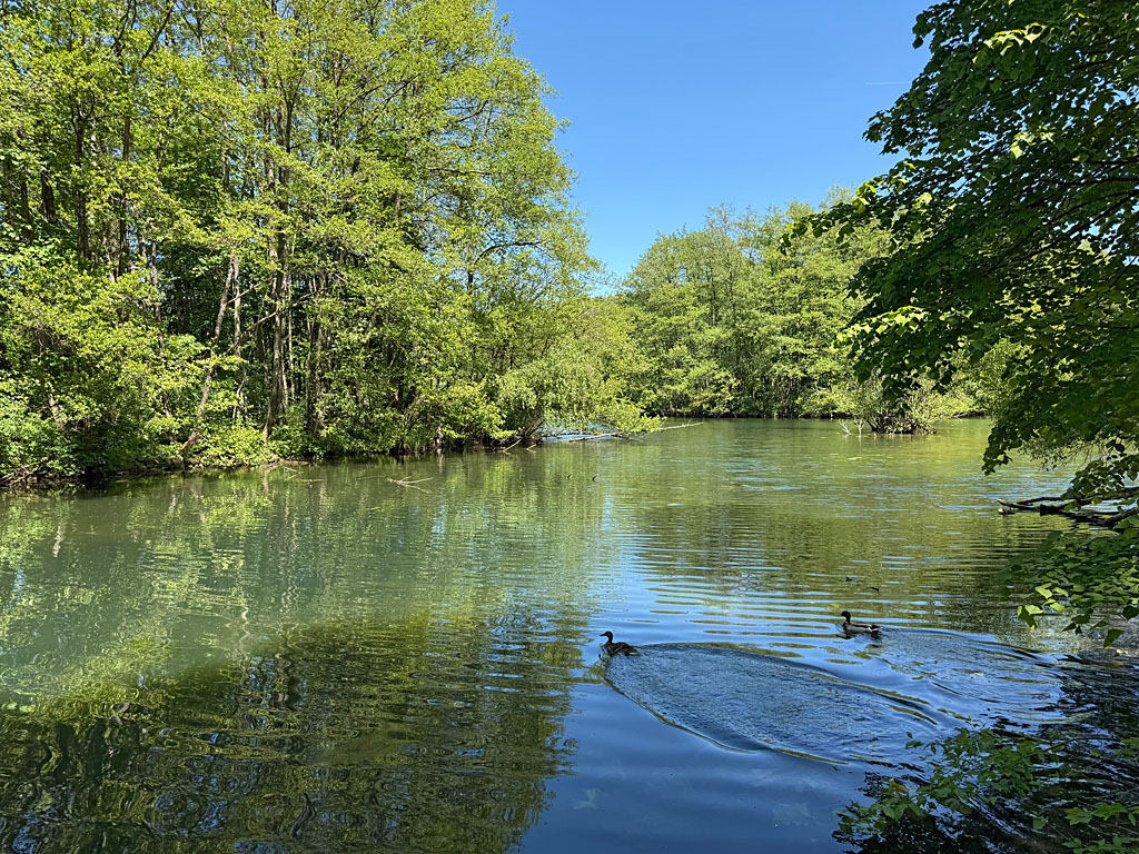 Mit Blick zum überdachten Unterstand am Waldparkplatz Ludwigshain wenden wir uns nach links und verlassen unseren Ausgangspunkt in nordwestlicher Richtung. An der ersten Verzweigung gehen wir geradeaus weiter und halten uns gleich darauf am folgenden Abzweig leicht links. Im Anschluss leitet uns der breite Forstweg bergab. Kurz vor der Staatsstraße treffen wir auf einen Fußweg und wenden uns nach rechts. Parallel zur Landstraße gelangen wir zu einer Teerstraße und gehen geradeaus weiter. Bei Heidenstein biegen wir kurz vor der Altmühl rechts in einen Teerweg und sofort wieder rechts in einen Karrenweg ein. In östlicher Richtung führt uns dieser führt uns dieser zum Altwasser der Altmühl.