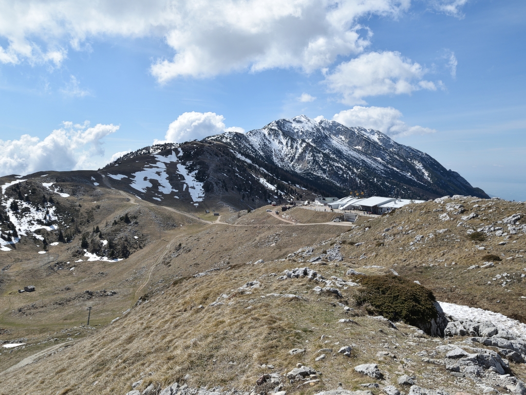 Nachdem uns die Seilbahn recht bequem fast 1700 hm von Malcesine zum Bocca Trato Spino gebracht hat, kann unsere Runde auf dem Monte Baldo starten. Zunächst halten wir uns links und spazieren auf dem hier noch recht breiten Weg zur Hütte La Capannina. Freilich, die sonnige Terrasse lädt schon jetzt zu einer Rast ein, da wir aber bisher noch nicht viel aus eigener Muskelkraft geleistet haben, heben wir uns die Einkehr für später auf. Stattdessen besuchen wir über einen Trampelpfad den Monte Grande, einen kleinen Aussichtspunkt, der sich etwas östlich der Hütte befindet und genießen die Aussicht in vollen Zügen.