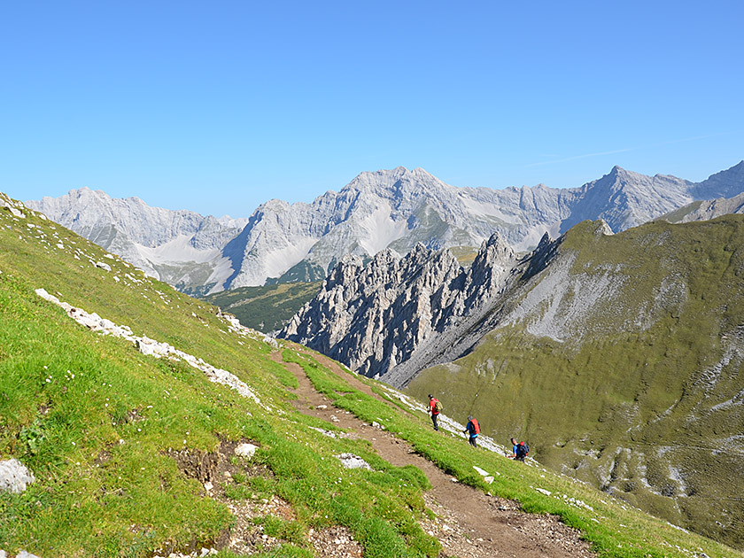 Der Goetheweg ist ein landschaftlich eindrucksvoller Höhenweg im Karwendel. Hoch über den Dächern von Innsbruck leitet der Weg von der Bergstation der Nordkettenbahn am Hafelekar zur Pfeishütte. Die zweistündige Wanderung ist gleichzeitig der schnellste Zugang zur herrlich im hinteren Samertal gelegenen Alpenvereinshütte. Zu Beginn der Tour queren wir die Südseite der Nordkette und erleben einen schwindelerregenden Tiefblick auf das Inntal. Teilweise ist das Terrain sehr ausgesetzt und der Weg an vielen Stellen mit Drahtseilen gesichert. An der Mühlkarscharte wechseln wir auf die Nordseite der Bergkette und queren oberhalb des Mühlkars an den schroffen Wänden der Mandlspitze vorbei. Hier genießen wir den herrlichen Blick auf die Bergwelt rund um das Gleirschtal und zur Zugspitze. Über eine Steilstufe erreichen wir schließlich mit der Mandlscharte den letzten Sattel vor der Pfeishütte. An der Scharte blicken wir hinüber zur markanten Rumer Spitze und über das Samertal zur Stempeljochspitze. Von der Mandlscharte wandern wir schließlich im zahmeren Terrain gut 350 Höhenmeter hinunter zur Pfeishütte. Dort hat man sich erst einmal eine ausgiebige Stärkung verdient, bevor wir uns auf den Weg zurück zur Bergstation am Hafelekar machen. Die meisten Höhenmeter werden dabei am Rückweg bewältigt. Alternativ kann man auch direkt über die Arzler Scharte oder das Kreuzjöchl den langen Abstieg zur Hungerburg in Angriff nehmen.