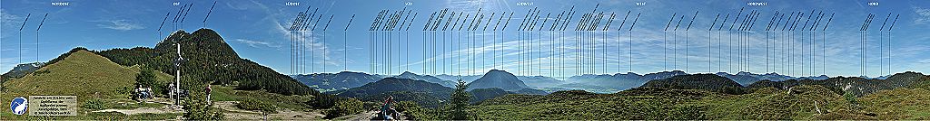 Hinter unserem Frühstücksrestaurant geht es über den gebührenpflichtigen Wanderparkplatz weiter zur Walleralm. Am Rande einer Almwiese begrüßen wir die Kälber, bevor wir wieder in den halbschattigen Wald eintauchen. An einer Gabelung halten wir uns links, später, nachdem es ein Stück bergab ging, wieder rechts. Dank der guten Beschilderung ist ein Verlaufen nahezu unmöglich. Eine gute halbe Stunde später lichtet sich der Wald und wir bewegen uns im freien Gelände auf den Gipfel zu. Hinter uns wird die Fernsicht immer besser. Im Südwesten prägt vor allem der grasbewachsene Pölven die Sicht. In einem kleinen Sattel erfahren wir auf einer Informationstafel von Ferdinand dem Raben, dass es auf der Walleralm sogar einmal gespukt hatte. Da dem Spuk durch fünf mutige Kufsteiner ein Ende bereitet wurde, können wir furchtlos auf einem kleinen Pfad nach Norden zum Kreuzbichl aufsteigen. Knapp zehn Minuten später haben wir den höchsten Punkt unseres Ausflugs erreicht und erholen uns bei einer wunderschönen Aussicht von den Strapazen.