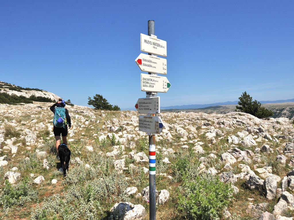 Im Sattel halten wir uns links. Etwa 200 m trennen uns noch von dem kleinen Gipfel des Bags. Oben angekommen haben wir einen recht schönen Blick auf die Bucht von Baska. Südöstlich von uns zeigt sich die unbewohnte Insel Prvic und dahinter das Velebit Gebirge am Festland. Etwas weiter rechts fällt der Blick hinter zwei kleineren Inseln auf Raab. Im Nordwesten ist bereits ein großer Teil unseres weiteren Wegverlauf Richtung Veliki Hlam zu sehen.