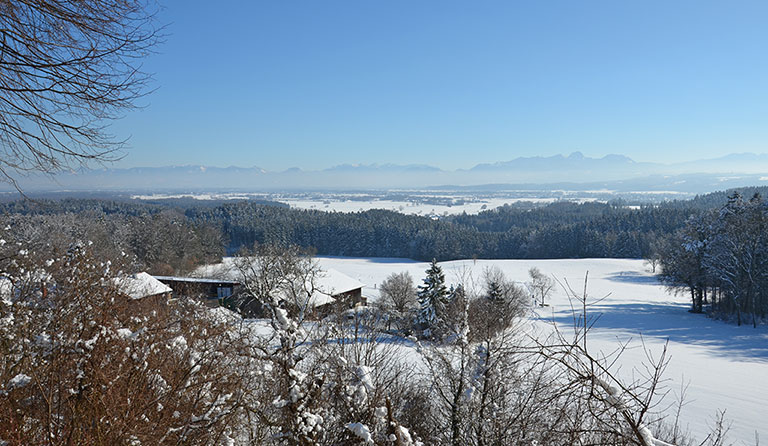 Der Wanderweg der Sinne ist eine beschilderte Route, die von Maxhofen im Mangfalltal hinauf zur Schönen Aussicht in Kleinhöhenrain führt. Die Wanderung ist für die ganze Familie geeignet und besticht schon zu Beginn mit schönen Ausblicken zu den Chiemgauer Alpen und zum Mangfallgebirge. Dem Kreuzweg folgend leitet der Lehr- und Erlebnispfad über Felder, durch Waldstücke und über Bachgräben hinauf zur im 12. Jahrhundert erbauten Filialkirche St. Bartholomäus und zum Gasthof Schöne Aussicht. Seinen Namen hat der Gasthof nicht ohne Grund: Am Balkon über dem Mangfalltal schweift der Blick vom Teisenberg im Osten über den Hochfelln und den Hochgern zur Kampenwand, über den Geigelstein zum Spitzstein. Vom Kaisergebirge schauen wir weiter nach Westen zum Wendelstein, zur Bergwelt rund um den Spitzingsee und über die Tegernseer Berge bis hin zur Benediktenwand. Im Gasthof Schöne Aussicht hat man sich im schattigen Panoramabiergarten oder in der gemütlichen Stube eine Brotzeit oder einen hausgemachten Kuchen verdient, bevor es auf gleichem Wege wieder hinunter ins Mangfalltal nach Maxhofen geht.