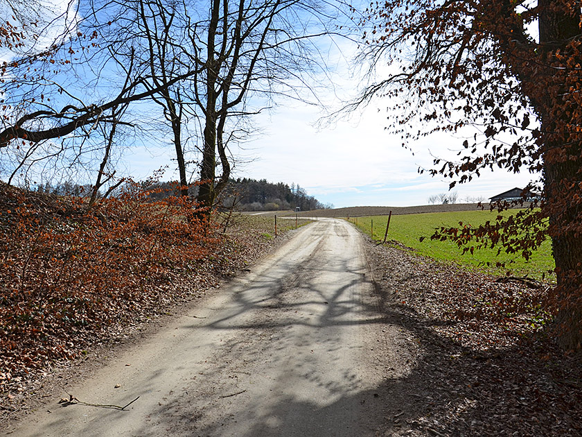 Dort halten wir uns gleich nach der Kapelle schräg links und verlassen Halbing über einen Forstweg. Sobald sich der Weg gabelt, wählen wir den rechten Weg und spazieren in nordöstlicher Richtung in das Mailinger Holz hinein. Einen ersten Abzweig, der nach links wegführt, ignorieren wir. Den Weg, der wenig später rechter Hand von schräg hinten in unseren mündet, ignorieren wir ebenfalls und biegen gleich darauf bei der folgenden Weggabelung rechts ab. Kurze Zeit später kommen wir zu einer zweiten Weggabelung und gehen nochmal nach rechts. In einem Links- und einem Rechtsbogen führt uns der Forstweg bergab und aus dem Wald hinaus. Am Waldrand treffen wir auf einen Querweg und biegen rechts ab. Zuerst in südlicher und später in südöstlicher Richtung folgen wir dem Weg entlang des Waldrands.