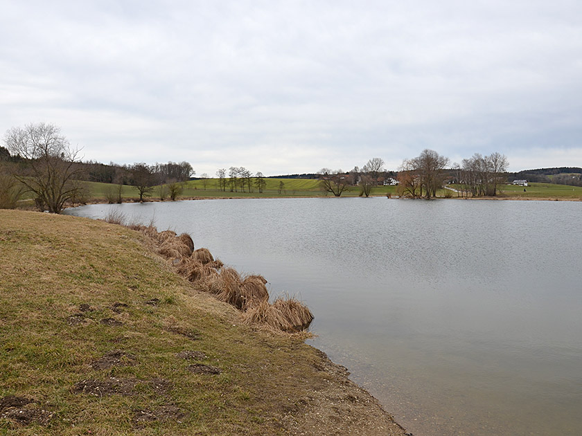 Wir ignorieren dabei alle Abzweige und treffen später beim Weiler Au auf eine Querstraße. Nun biegen wir rechts und bei der nächsten Möglichkeit gleich wieder links Richtung Schrankenschneider ab. Wir gehen durch den Schrankenschneiderhof hindurch und biegen am Waldrand links ab. Ein Forstweg leitet uns im Anschluss in östlicher Richtung durch das Steinhöringer Holz. Wir spazieren immer geradeaus und kommen am Ostrand des Waldes zu einem kleinen Weiher und zu einem Querweg. Nun halten wir uns rechts und biegen nach einer Rechtskurve gleich wieder links ab. Den Wald lassen wir nun endgültig hinter und erkennen vor uns die Berger Lacke, zu der wir hinunter spazieren. Auf Höhe des Weihers biegen wir rechts in den Seeweg ein.