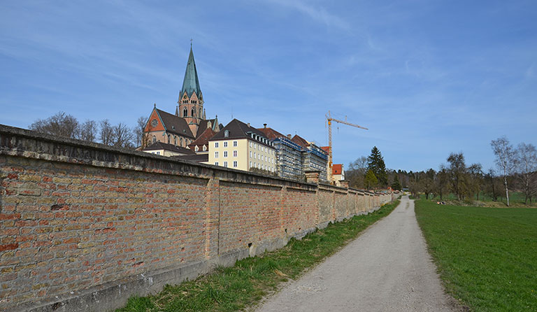 Nach einer sanften Rechtskurve und einem kurzen Abstieg verlassen wir die Pflaumdorfer Straße nach links und biegen in die Emminger Straße ein. Nun folgen wir der Emminger Straße in nordöstlicher Richtung und passieren das Sportgelände des TSV Eresing. Danach mündet die Teerstraße in einen Feldweg, dem wir weiter geradeaus folgen. Der Weg leitet uns zuerst über Felder nordostwärts. Nach einer Rechtskurve schlängelt sich der Forstweg durch lichte Wälder in östlicher Richtung. Schließlich erreichen wir die Klosteranlage und folgen der Mauer des Klausurgartens Richtung Osten. Bei der ersten Möglichkeit biegen wir links in die Klosteranlage ein und wandern hinauf zur Klosterkirche von Sankt Ottilien. Wir gehen weiter geradeaus und gelangen kurz darauf zum Klosterladen und zum Biergarten des Emminger Hofs, der zu einer ausgiebigen Rast einlädt.