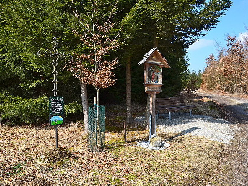 Nach knapp 20 Minuten treffen wir im Wald auf eine Kreuzung mit einer Sitzbank und einem Wegkreuz. Hier gehen wir geradeaus weiter. Nach weiteren zehn Minuten erreichen wir einen beschilderten Abzweig. Hier biegen wir nach schräg links Richtung Walchstadt und Steinebach ab. Nach knapp zehn Minuten verlassen wir den Wald und folgen dem breiten Weg über freies Feld und vorbei an kleinen Weihern zu einer Querstraße. Hier biegen wir rechts ab und gehen entlang der Landstraße bis zur Autobahnbrücke (keine Gehwege). Dann gehen wir nach links, überqueren die Autobahn und folgen der Landstraße südwärts Richtung Walchstadt.