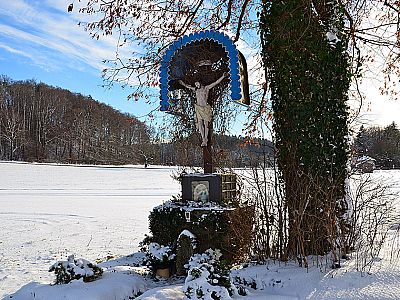 Über einen Feldweg spazieren wir in südlicher Richtung entlang von Pferdekoppeln. Die Ortschaft Großhelfendorf haben wir nun hinter uns gelassen und wir wandern über freies Feld auf ein Waldstück zu. Wir durchschreiten den kleinen Wald und treffen danach auf eine Straße. Hier biegen wir rechts ab und folgen der wenig befahrenen Straße nach Grub. Wir gehen immer geradeaus und passieren ein großes Wegkreuz, welches unter einer Linde am Rande der Straße thront. Das sogenannte Schindlerkreuz wurde zum Gedenken an die früheren Holzarbeiten und die damit verbundenen Strapazen errichtet. Kurz nach dem Schindlerkreuz treffen wir auf eine Querstraße.