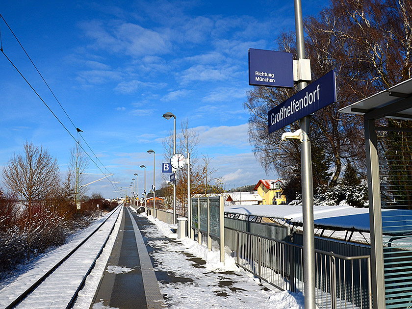 Wir beginnen unsere Wanderung am Bahnhof in Großhelfendorf. Wir folgen dem Bahnsteig in Fahrtrichtung, erreichen einen geteerten Weg und spazieren entlang der Gleise am Bürogebäude der Firma Fritzmeier vorbei. Beim Bahnübergang gelangen wir zu einer Straße. Wir überqueren die Straße, wenden uns nach links und treffen nach wenigen Metern auf den Grubmühlweg, der von der Straße nach rechts weg führt. Hier biegen wir rechts in den Grubmühlweg ein und gehen zwischen zwei Fabrikhallen hindurch. Am Ende des Weges halten wir uns rechts, gehen auf ein Bürogebäude zu und biegen noch vor dem Haus links ab.