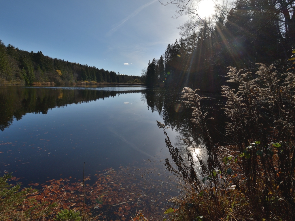 Auf dem Weg weiter nach Pähl beginnt ein äußert reizvoller Teil unserer Wanderung. Nach Süden kann man immer wieder einen Blick auf die Alpen werfen, im Westen zeigen sich der Ammersee und Dießen mit dem Marienmünster. Knapp 3 km nachdem wir den Wald betreten haben, biegen wir rechts Richtung Hartkapelle und Pähl ab. Etwa 100 m später haben wir das kleine Gotteshaus erreicht und halten kurz inne. Ein Gedicht an der Wand der Kapelle lädt zum Nachdenken ein. Anschließend folgen wir weiter dem breiten Weg nach Süden. Kurz vor dem Hochschlossweiher zweigt nach rechts ein etwas unscheinbarer Pfad ab. Wenige Minuten später haben wir das Nordufer des Weihers erreicht. Wir machen eine Pause und genießen wie sich die Sonne und die Bäume auf der glatten Seeüberfläche spiegeln. Ein Stück westlich vom See marschieren wir weiter nach Pähl. Wer möchte und ein paar Minuten Zeit mitbringt, sollte hier der Pähler Schlucht einen Besuch abstatten.
