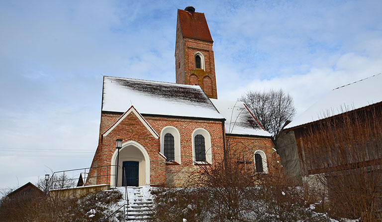 Innerhalb von fünf Minuten erreichen wir eine kleine Siedlung. Hier folgen wir der Vorfahrtsstraße nach links. Nun bleiben wir immer auf der Straße und spazieren über freie Felder in weiteren 15 Minuten bis zu einem Bahndamm. Wir gehen durch die Unterführung hindurch und gelangen nach Unterschwillach. Nach kurzer Zeit treffen wir auf den beschilderten Abzweig nach Dürnberg. Bevor wir hier links nach Dürnberg abbiegen, spazieren wir noch einige Meter geradeaus und statten der Filialkirche St. Stephanus einen Besuch ab. Nach der Besichtigung kehren wir zum Abzweig zurück und schlagen den Weg nach Dürnberg ein. Wir überqueren die Schwillach und biegen bei der nächsten Möglichkeit links ab Richtung Dürnberg.