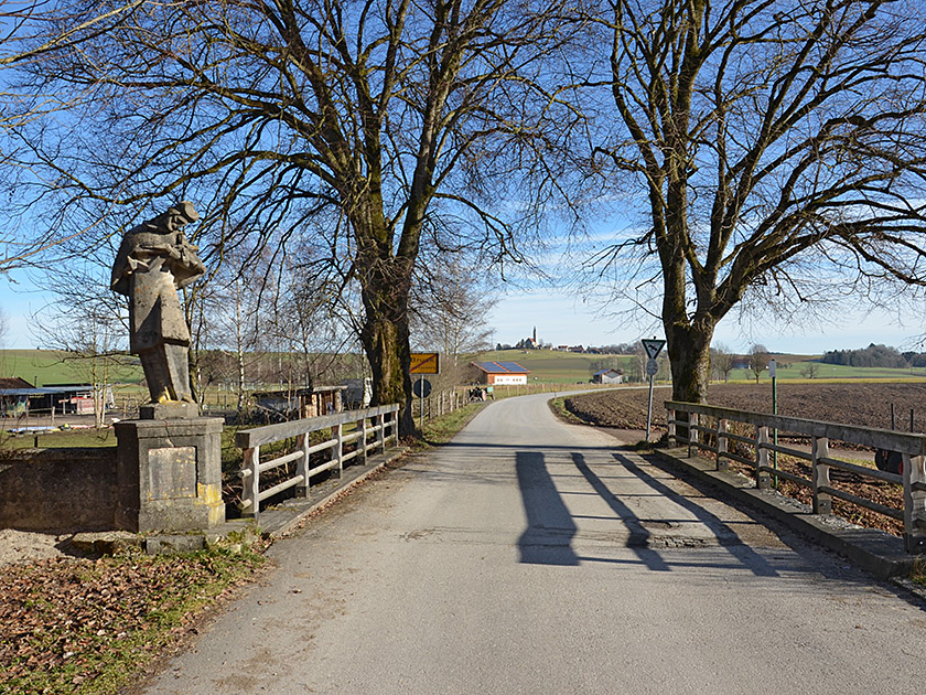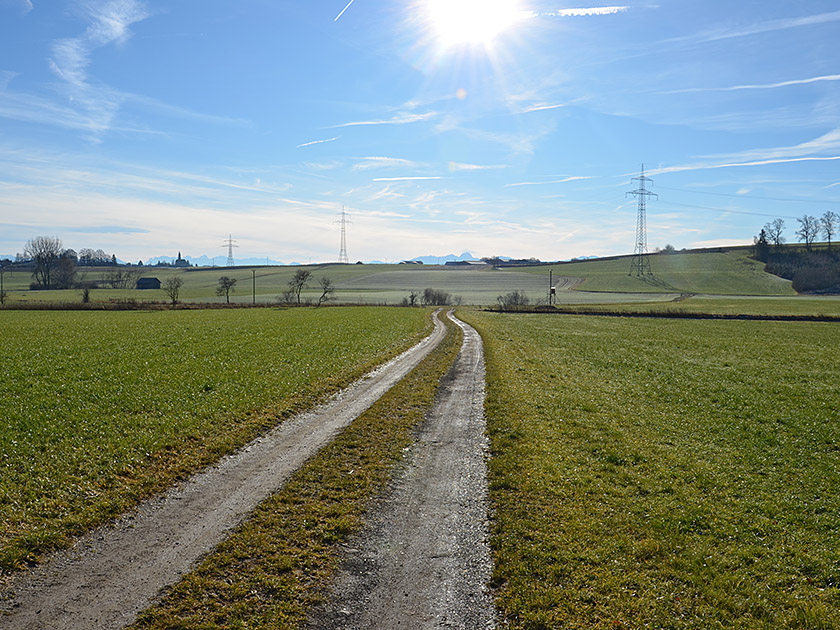 Ein Teerweg leitet uns in südlicher Richtung bergab und mit schönem Bergblick vor Augen erreichen wir kurz vor Bruck eine Landstraße. Wir überqueren diese und spazieren nach Bruck hinein. Bei der ersten Kreuzung biegen wir links ab und gehen in östlicher Richtung durch Bruck hindurch. Schließlich überqueren wir die Moosach und verlassen die Ortschaft Bruck. Sobald die Teerstraße eine sanfte Linkskurve vollzieht, gehen wir nach rechts in einen Feldweg und wenden uns sofort wieder nach links. Der Karrenweg leitet uns nordostwärts auf die weithin sichtbare Kirche St. Michael von Alxing zu. Schließlich mündet der Feldweg in eine Teerstraße und wir wenden uns nach rechts. Wir folgen der Teerstraße in südöstlicher Richtung zu einem Wegkreuz und biegen dort linkshaltend in einen Feldweg ein.