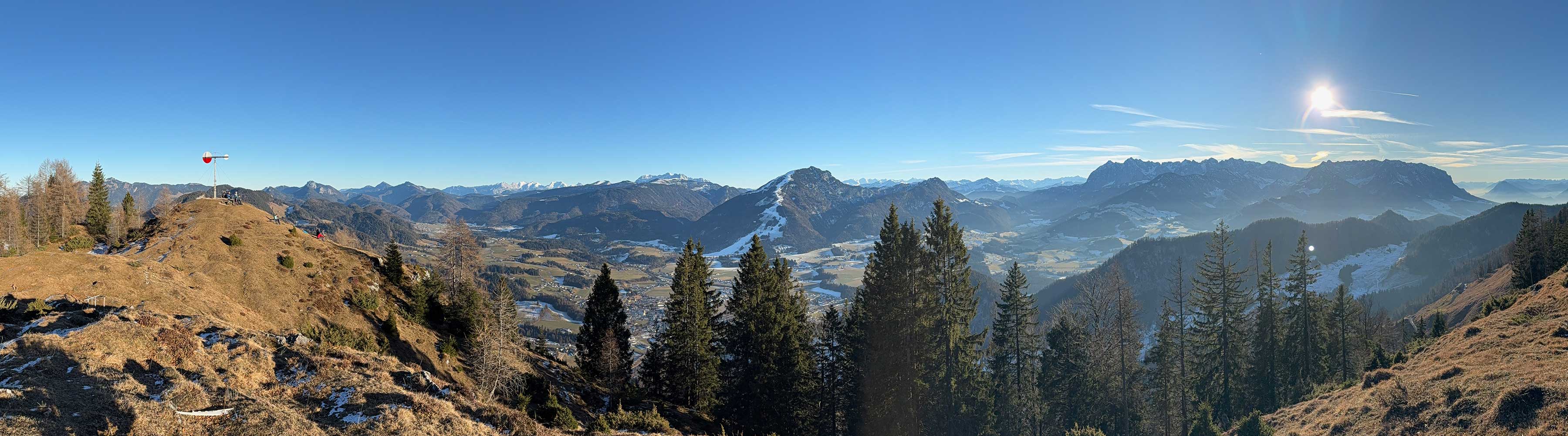 Die Wetterfahne (1284 m) selbst ist auch als alleiniges Gipfelziel sehr lohnend. Der Ausblick vom Wiesengipfel steht dem an der Rudersburg in nichts nach. Herrlich ist die Aussicht über Kössen zu den Hohen Tauern und nach Südwesten auf das Kaisergebirge. Von der Wetterfahne kann man auf einem kleinen Pfad direkt zur Naringalm absteigen. Dieser quert allerdings abschüssige Wiesenhänge und ist bei Eis und Schnee nicht zu empfehlen. Zur Weidesaison werden bei Schönwetter an der Naringalm Getränke und Brotzeiten serviert.